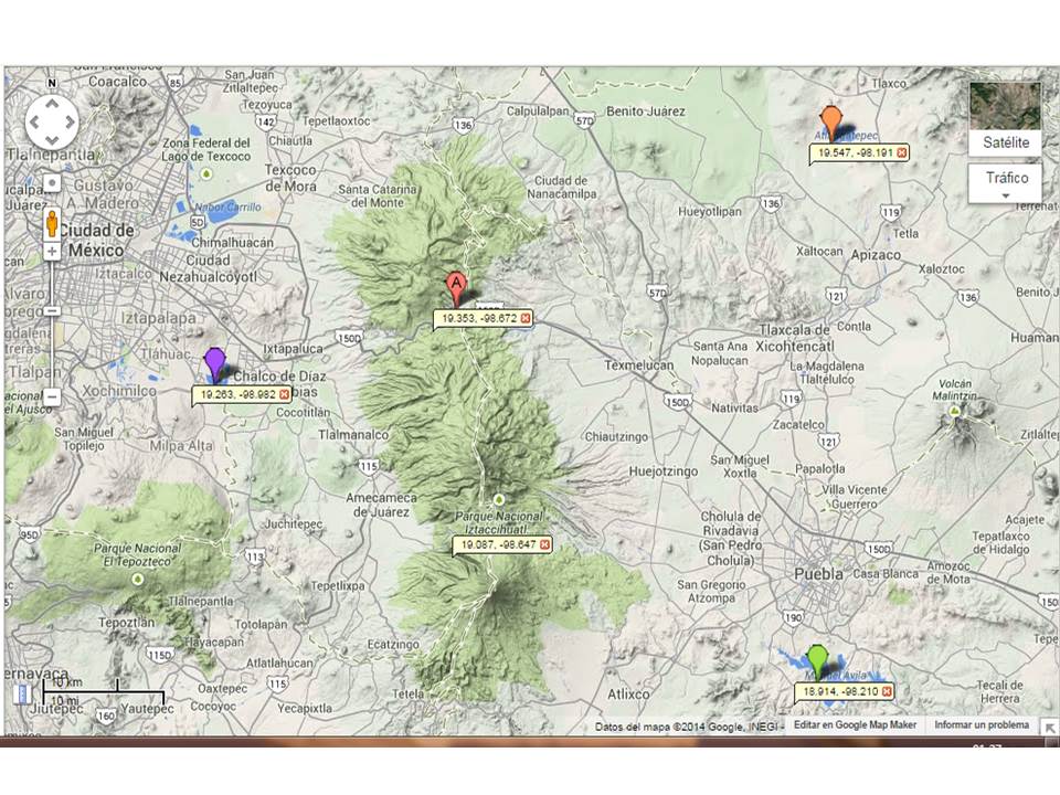 - Con la figura mostrada abajo, guíate en Google Maps para geo-ubicar los tres cuerpos de agua dulce situados al noreste de cada punto rojo en la imagen. Estos cuerpos han sido establecidos como fuentes primarias para extinguir incendios dentro del parque Izta-Popo.