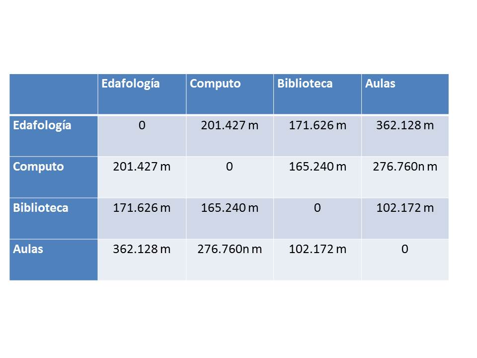 R= Los edificios más cercanos son los de aulas y biblioteca, así como también el de cómputo y biblioteca, los más alejados son edafología con aulas.