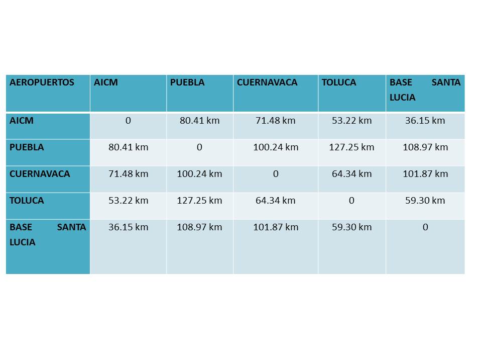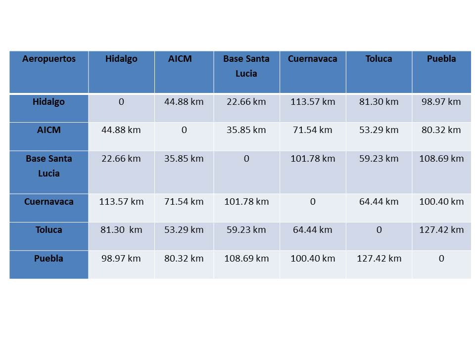 - De acuerdo a las distancias el posible Aeropuerto de Hidalgo ocuparía el segundo lugar en cercanía con respecto al aeropuerto AICM.