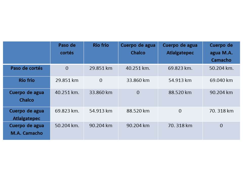 - Con base al segundo caso del ejercicio anterior (parque Izta-Popo), calcula las distancias medias entre el Paso de Cortés y los tres cuerpos de agua. Varía el orden de cercanía si se toma como referencia la localidad de Río Frío? R.-